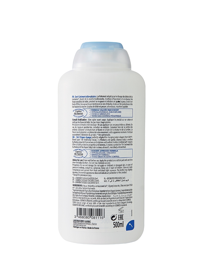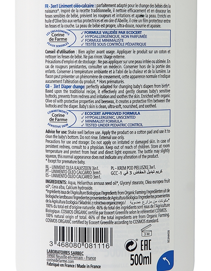 Certifié Ecocert COSMOS ORGANIC, le liniment oléo-calcaire Corine de Farme est parfaitement adapté pour le change des bébés dès la naissance*. Inspiré de la recette traditionnelle, il nettoie efficacement et en douceur les fesses sensibles de bébé, prévient les rougeurs et irritations et apaise la peau. Enrichi en huile d’Olive bio aux vertus protectrices et en cire d’Abeille, il crée un film protecteur entre les fesses et la couche. La peau de bébé est propre, ultra-douce, nourrie et apaisée.